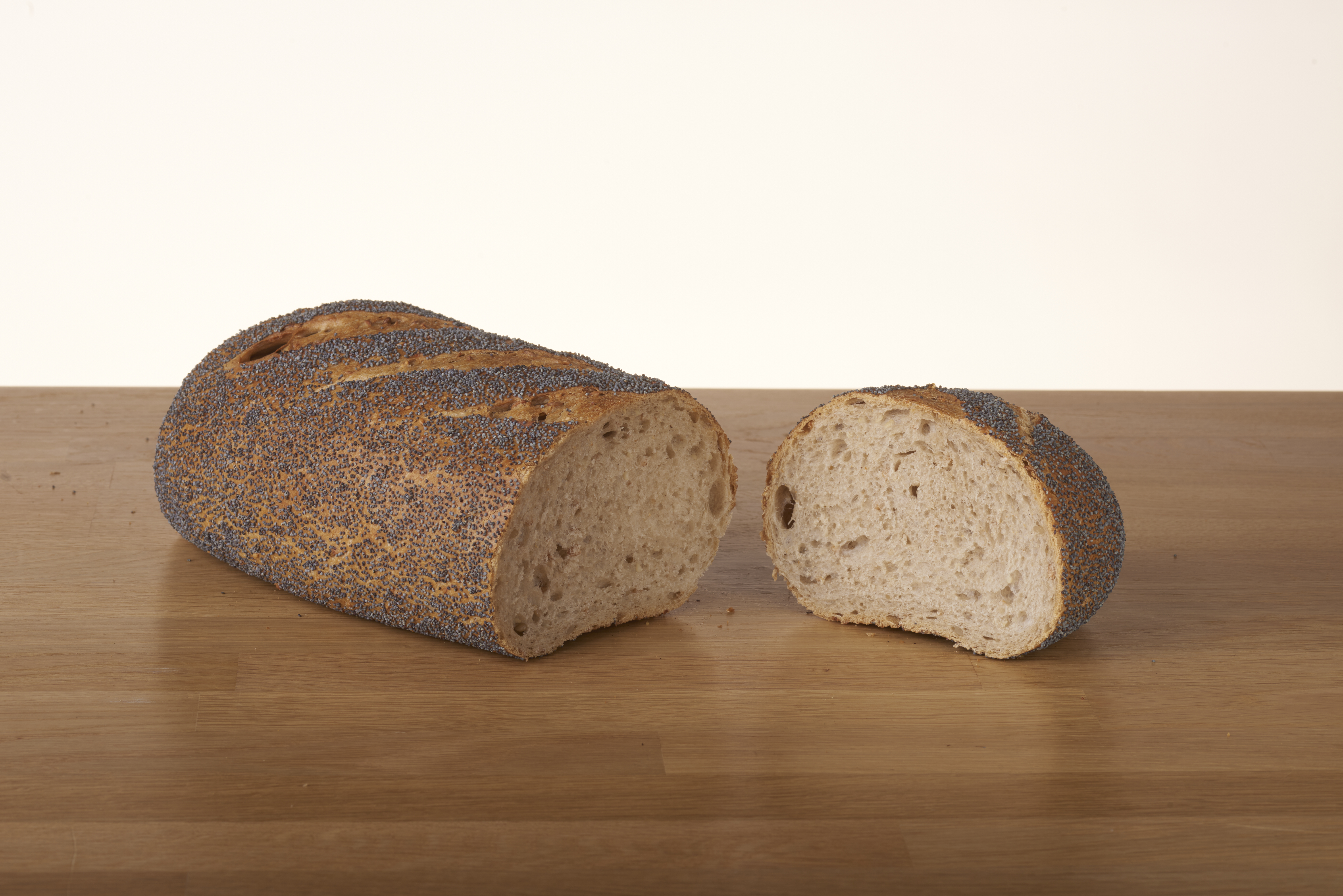 traditionelt bagt brød med surdej. med ristede sesam, solsikkekerne og hvedeflager. Blåbirkes på toppen.
